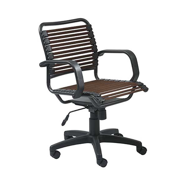 This comfortable office chair features a flat, bungie cord backrest and seat. A pneumatic height adjustment raises the seat from 17.5 inches to 21.5 inches high, while soft armrests and five caster wheels complete the design of this stylish office chair.