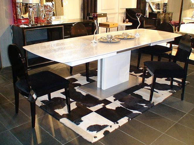The starting price is for Dining table only. Please select additional items for complete set.The chairs from the main picture are discontinued. Please select color of the leather chairs from additional pictureThis Collection features high gloss black and white wood accented by crocodile leather and polished chrome trim. It's the ideal setting when you want to mix a high end look in a casual environment.Extendable dining table with black high gloss table top, black crocodile texture middle extension outboard, black high gloss lacquer for vertical support part, and solid aluminum base.Features: