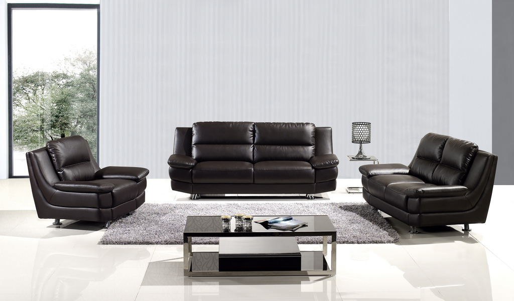 Modern Quality Italian bonded leather. Sofa set available in Black, Ivory, Tan, Snow White and Dark Chocolate colors.The sleek contemporary Sofa Set will give your living room a sophisticated style. The plush high tufted look back cushions and deep seat cushions will keep you cozy, offering enough space the whole family to lounge. Wide track arms and square tapered wood feet complete this modern look. This comfortable contemporary Sofa Set is sure to blend beautifully with your decor, for a warm and inviting look that everyone can enjoy.Sale by set of 3 only. Includes sofa, love seat and chair.Features: