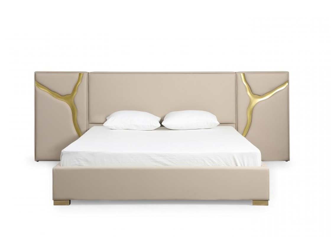 Extending on both sides of the bed, the headboard features champagne gold stainless steel lateral accents