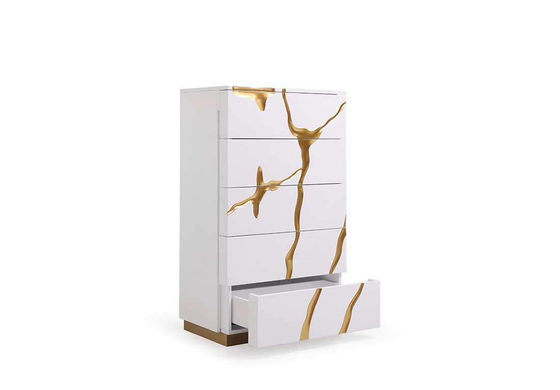 Luxurious and lavish characterizes the Danixa Modern White Bonded Leather & Gold Bed.