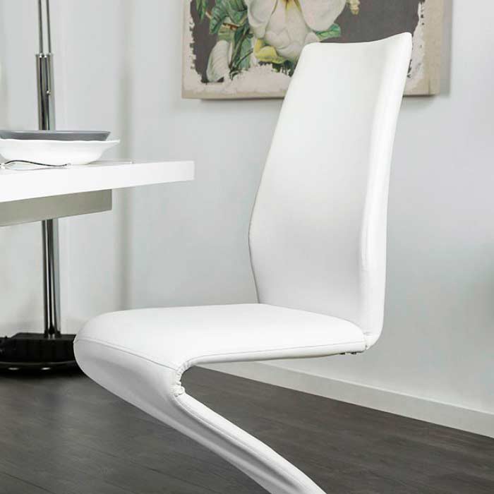 The chairs and the glossy, white table are accentuated with chrome highlights, giving this set a bright and glamorous feel.