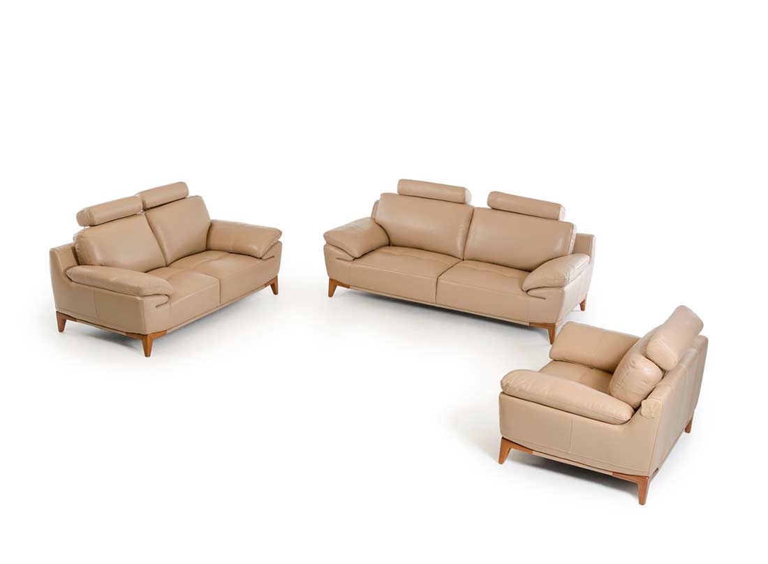 Modern Blue Leather Sofa Set features an alluring cozy design with flared armrests and adjustable headrests upholstered in sleek blue Cat. 4 8007 Italian leather/leather split. Dainty angled chrome legs provide stable support to this modern sofa set that is available by special order in 10-16 weeks.