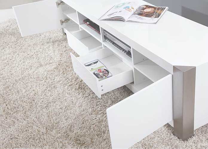 The BM01 Entertainment Console offers a creative, contemporary, style. This console is for a modern lifestyle. Enjoy the High Gloss White Finish with Stainless Steel Frame, 2 media drawers, and 2 media cabinets, giving you mega storage for all of your components and media.Features: